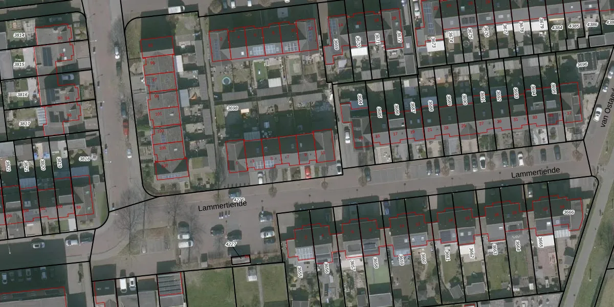 Het perceel waarop Lammertiende 9 staat heeft een oppervlakte van 3682 m². Dit is een zeer groot perceel. De perceeloppervlakte wordt geregistreerd door het Kadaster. Gedetailleerde informatie over de maten van dit perceel kunt u vinden in het rapport Kadastrale kaart met maatvoering van Lammertiende 9.