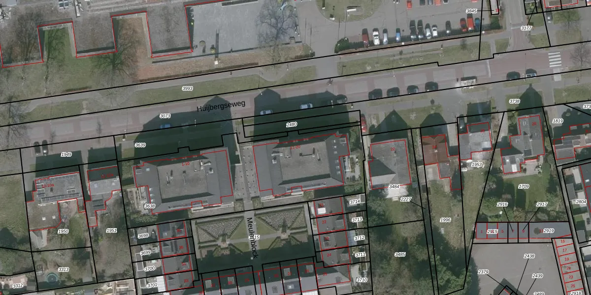 Het perceel waarop Meulenblock 12 staat heeft een oppervlakte van 1929 m². Dit is een zeer groot perceel. De perceeloppervlakte wordt geregistreerd door het Kadaster. Gedetailleerde informatie over de maten van dit perceel kunt u vinden in het rapport Kadastrale kaart met maatvoering van Meulenblock 12.