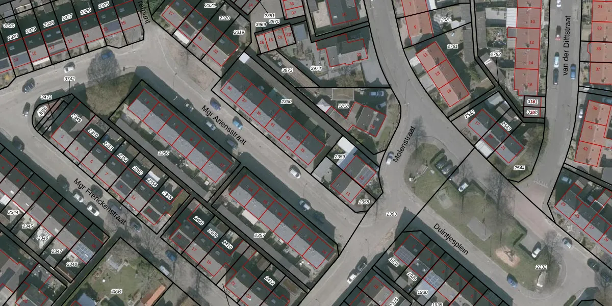 Mgr Ariensstraat 45 is gelegen op kadastraal perceel WDT00D2360. Deze kadastrale aanduiding is uniek en wordt gebruikt door het Kadaster om eigendomsrechten en andere zakelijke rechten vast te leggen. Het perceel maakt onderdeel uit van de kadastrale gemeente Woensdrecht.