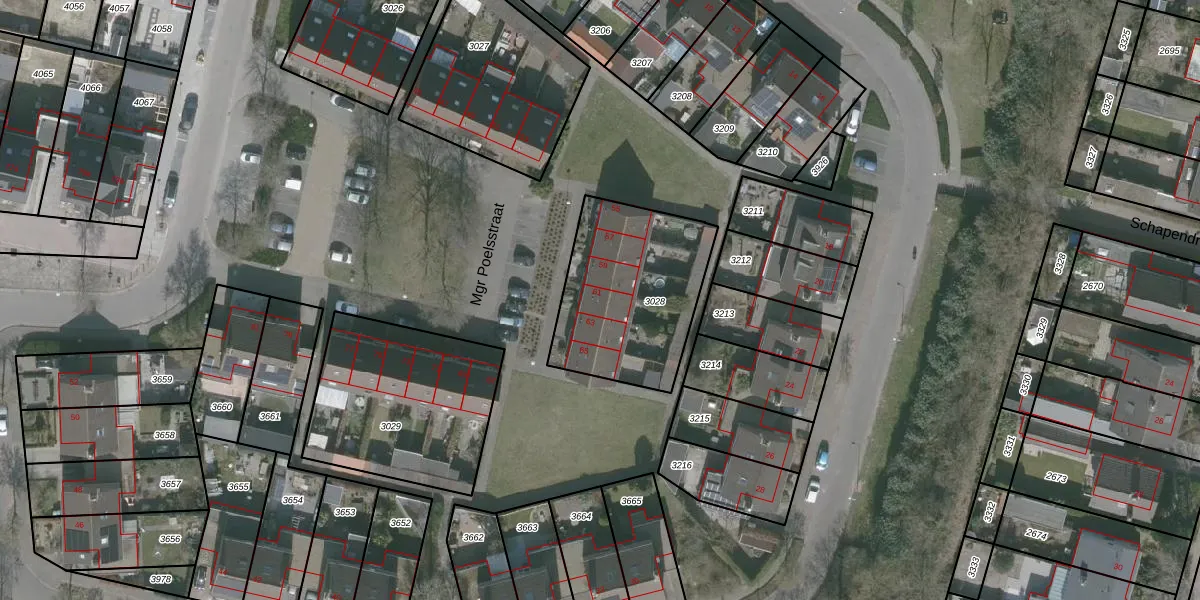 Het perceel waarop Mgr Poelsstraat 61 staat heeft een oppervlakte van 639 m². Dit is een groot perceel. De perceeloppervlakte wordt geregistreerd door het Kadaster. Gedetailleerde informatie over de maten van dit perceel kunt u vinden in het rapport Kadastrale kaart met maatvoering van Mgr Poelsstraat 61.