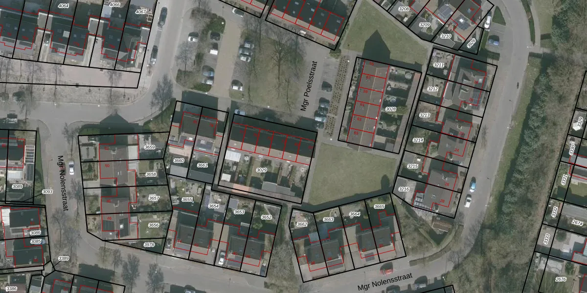 Het perceel waarop Mgr Poelsstraat 69 staat heeft een oppervlakte van 726 m². Dit is een groot perceel. De perceeloppervlakte wordt geregistreerd door het Kadaster. Gedetailleerde informatie over de maten van dit perceel kunt u vinden in het rapport Kadastrale kaart met maatvoering van Mgr Poelsstraat 69.