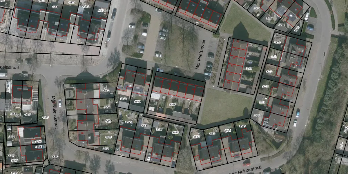 Het perceel waarop Mgr Poelsstraat 73 staat heeft een oppervlakte van 726 m². Dit is een groot perceel. De perceeloppervlakte wordt geregistreerd door het Kadaster. Gedetailleerde informatie over de maten van dit perceel kunt u vinden in het rapport Kadastrale kaart met maatvoering van Mgr Poelsstraat 73.