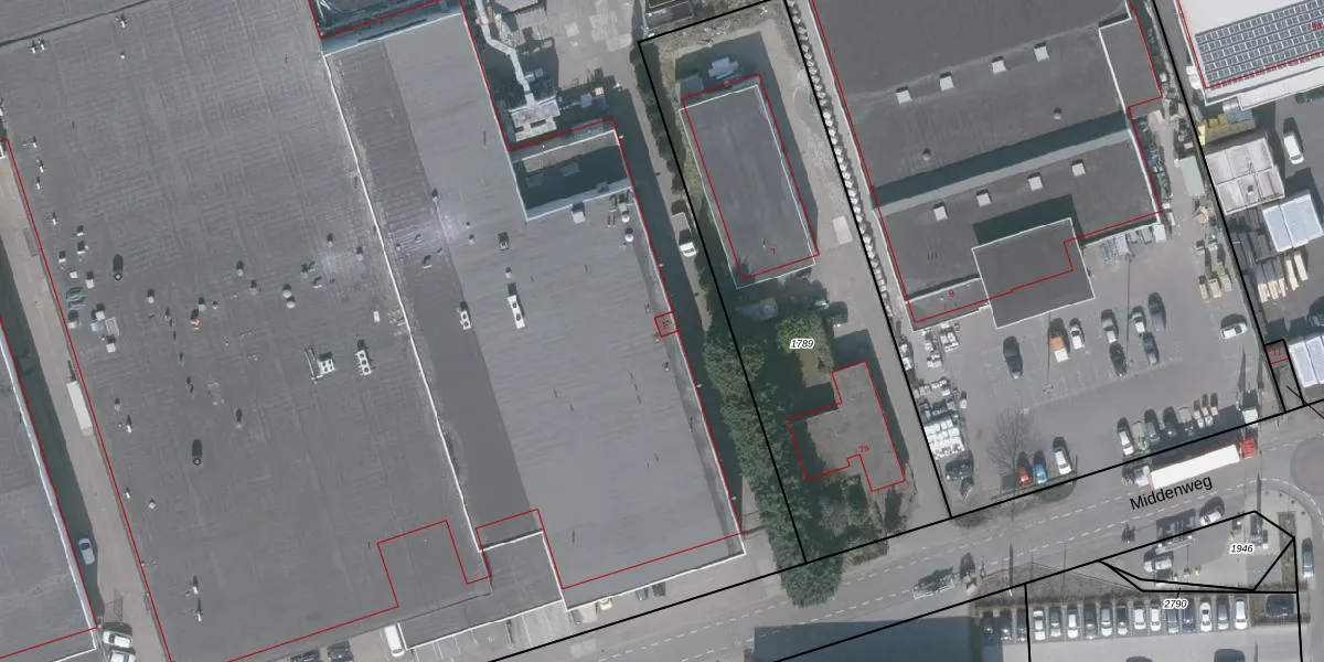 Het perceel waarop Middenweg 1-c staat heeft een oppervlakte van 4,4 ha. Dit is een zeer groot perceel. De perceeloppervlakte wordt geregistreerd door het Kadaster. Gedetailleerde informatie over de maten van dit perceel kunt u vinden in het rapport Kadastrale kaart met maatvoering van Middenweg 1-c.