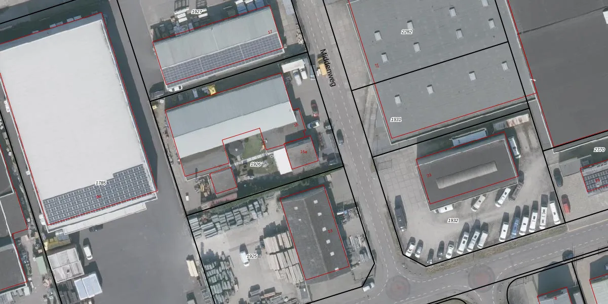 Het perceel waarop Middenweg 15-a staat heeft een oppervlakte van 2142 m². Dit is een zeer groot perceel. De perceeloppervlakte wordt geregistreerd door het Kadaster. Gedetailleerde informatie over de maten van dit perceel kunt u vinden in het rapport Kadastrale kaart met maatvoering van Middenweg 15-a.