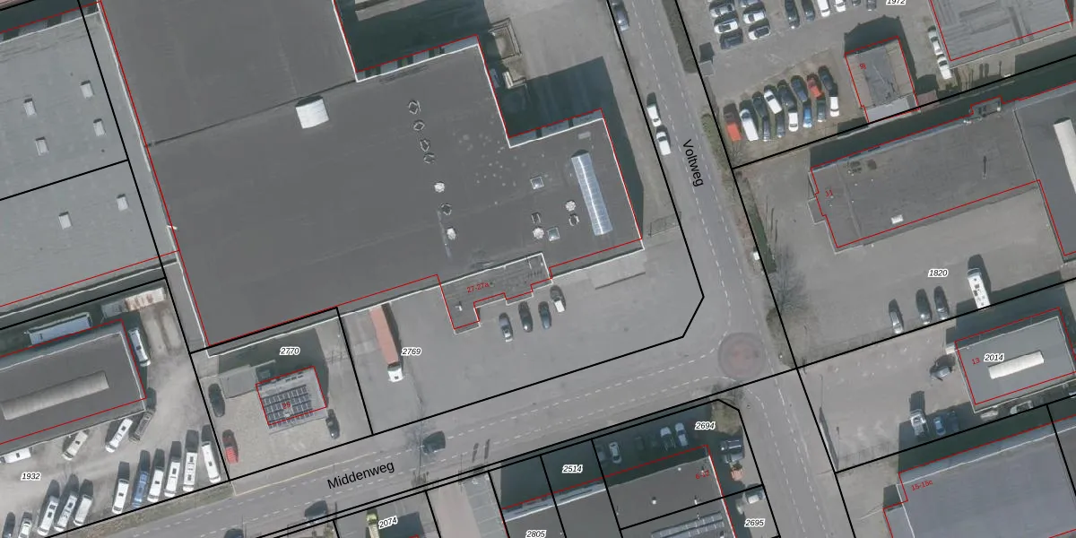 Het perceel waarop Middenweg 27-a staat heeft een oppervlakte van 9248 m². Dit is een zeer groot perceel. De perceeloppervlakte wordt geregistreerd door het Kadaster. Gedetailleerde informatie over de maten van dit perceel kunt u vinden in het rapport Kadastrale kaart met maatvoering van Middenweg 27-a.
