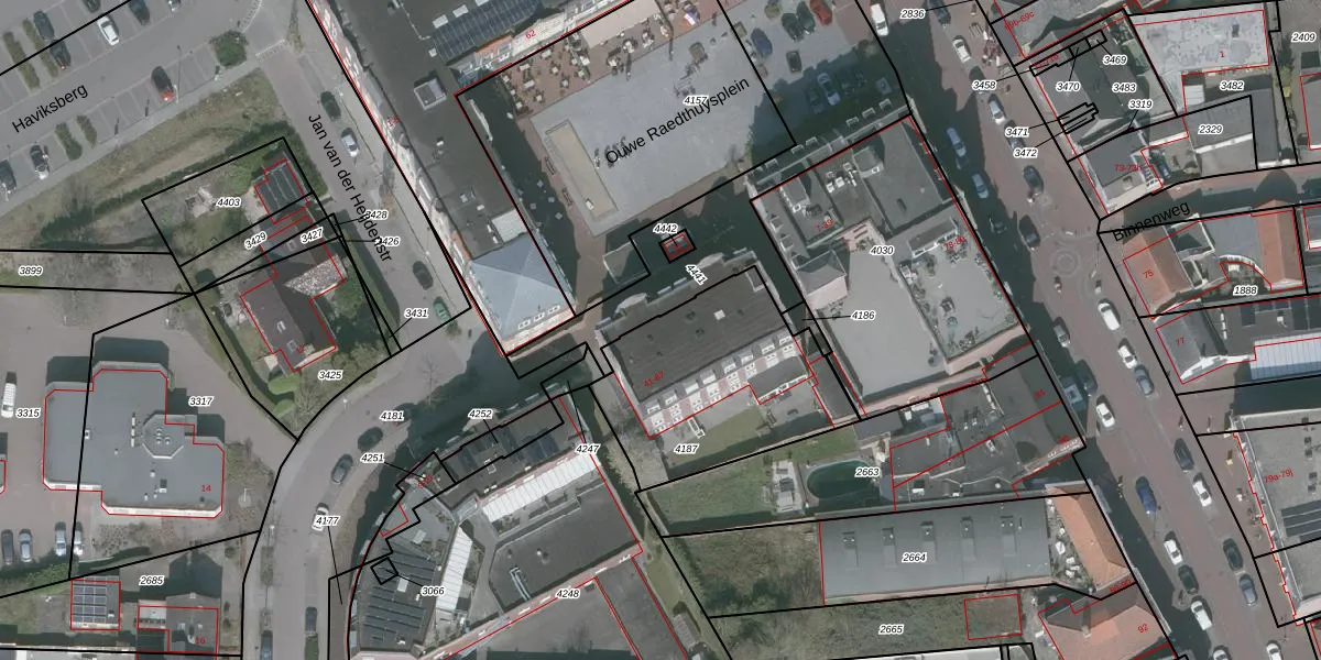 Het perceel waarop Ouwe Raedthuysplein 61 staat heeft een oppervlakte van 775 m². Dit is een groot perceel. De perceeloppervlakte wordt geregistreerd door het Kadaster. Gedetailleerde informatie over de maten van dit perceel kunt u vinden in het rapport Kadastrale kaart met maatvoering van Ouwe Raedthuysplein 61.