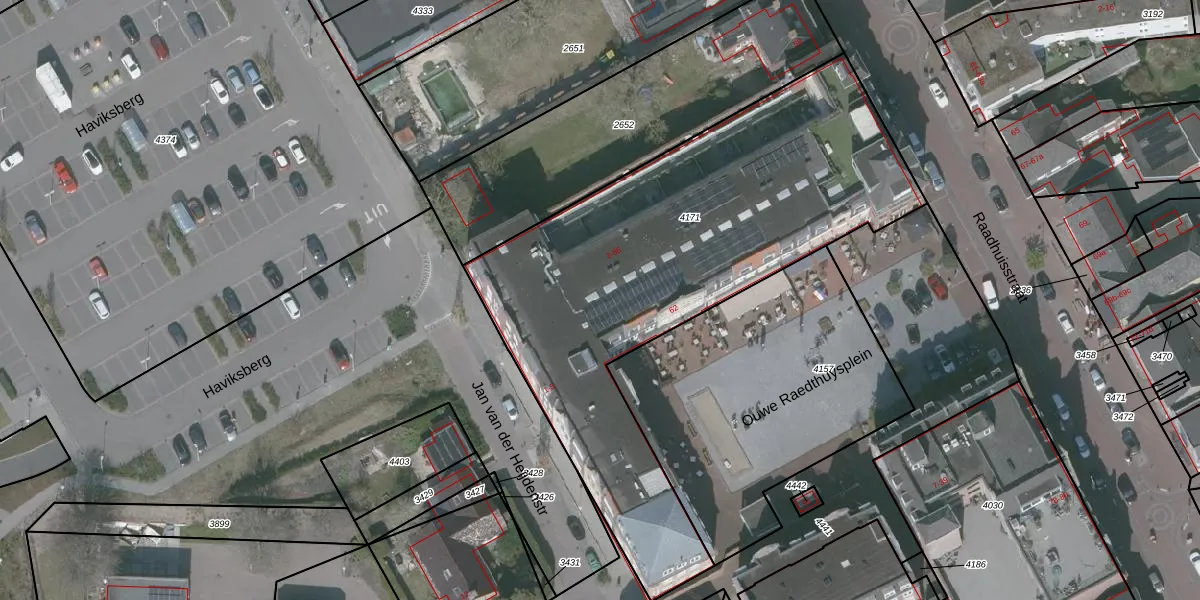 Het perceel waarop Ouwe Raedthuysplein 76 staat heeft een oppervlakte van 2415 m². Dit is een zeer groot perceel. De perceeloppervlakte wordt geregistreerd door het Kadaster. Gedetailleerde informatie over de maten van dit perceel kunt u vinden in het rapport Kadastrale kaart met maatvoering van Ouwe Raedthuysplein 76.