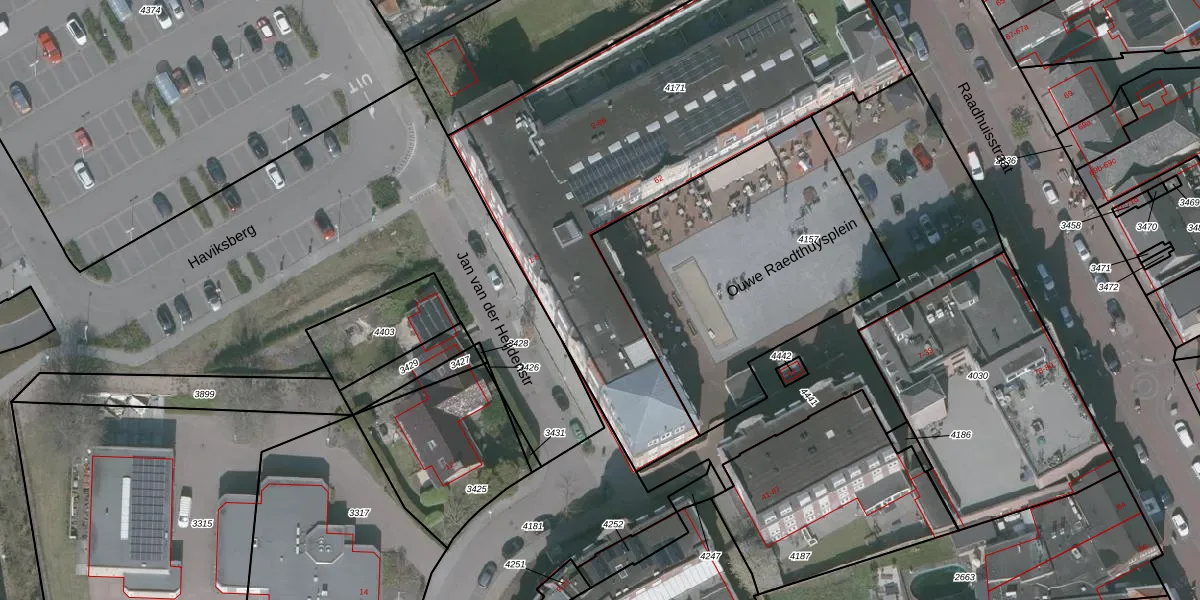 Het perceel waarop Ouwe Raedthuysplein 82 staat heeft een oppervlakte van 2415 m². Dit is een zeer groot perceel. De perceeloppervlakte wordt geregistreerd door het Kadaster. Gedetailleerde informatie over de maten van dit perceel kunt u vinden in het rapport Kadastrale kaart met maatvoering van Ouwe Raedthuysplein 82.