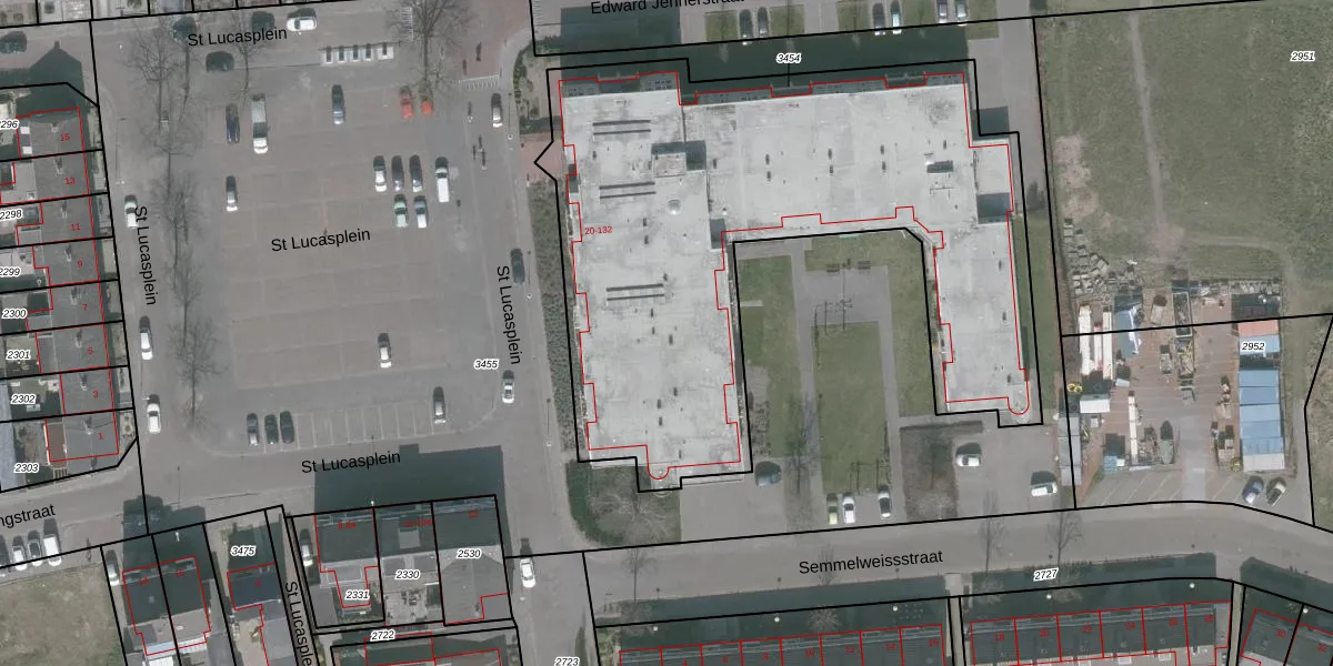 Het perceel waarop St Lucasplein 130 staat heeft een oppervlakte van 3060 m². Dit is een zeer groot perceel. De perceeloppervlakte wordt geregistreerd door het Kadaster. Gedetailleerde informatie over de maten van dit perceel kunt u vinden in het rapport Kadastrale kaart met maatvoering van St Lucasplein 130.