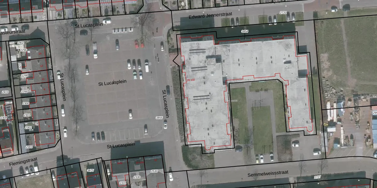 Het perceel waarop St Lucasplein 26 staat heeft een oppervlakte van 3060 m². Dit is een zeer groot perceel. De perceeloppervlakte wordt geregistreerd door het Kadaster. Gedetailleerde informatie over de maten van dit perceel kunt u vinden in het rapport Kadastrale kaart met maatvoering van St Lucasplein 26.