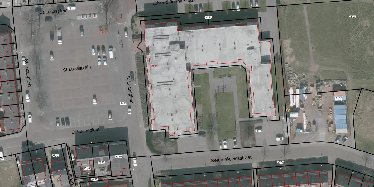 Het perceel waarop St Lucasplein 38 staat heeft een oppervlakte van 3060 m². Dit is een zeer groot perceel. De perceeloppervlakte wordt geregistreerd door het Kadaster. Gedetailleerde informatie over de maten van dit perceel kunt u vinden in het rapport Kadastrale kaart met maatvoering van St Lucasplein 38.