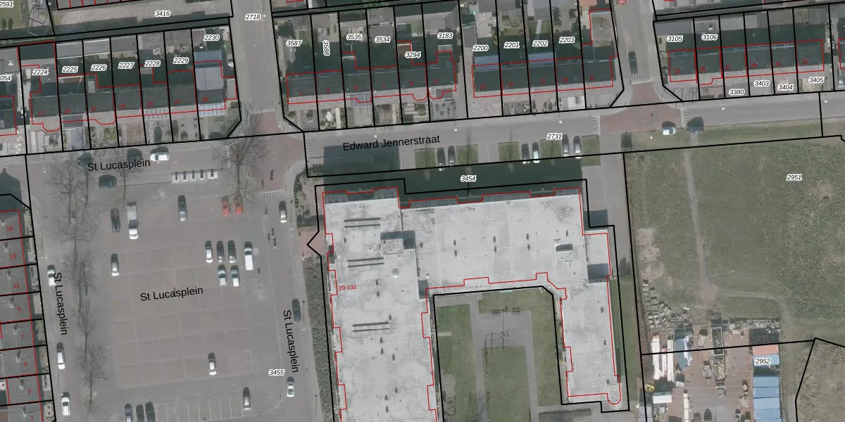 Het perceel waarop St Lucasplein 62 staat heeft een oppervlakte van 3060 m². Dit is een zeer groot perceel. De perceeloppervlakte wordt geregistreerd door het Kadaster. Gedetailleerde informatie over de maten van dit perceel kunt u vinden in het rapport Kadastrale kaart met maatvoering van St Lucasplein 62.