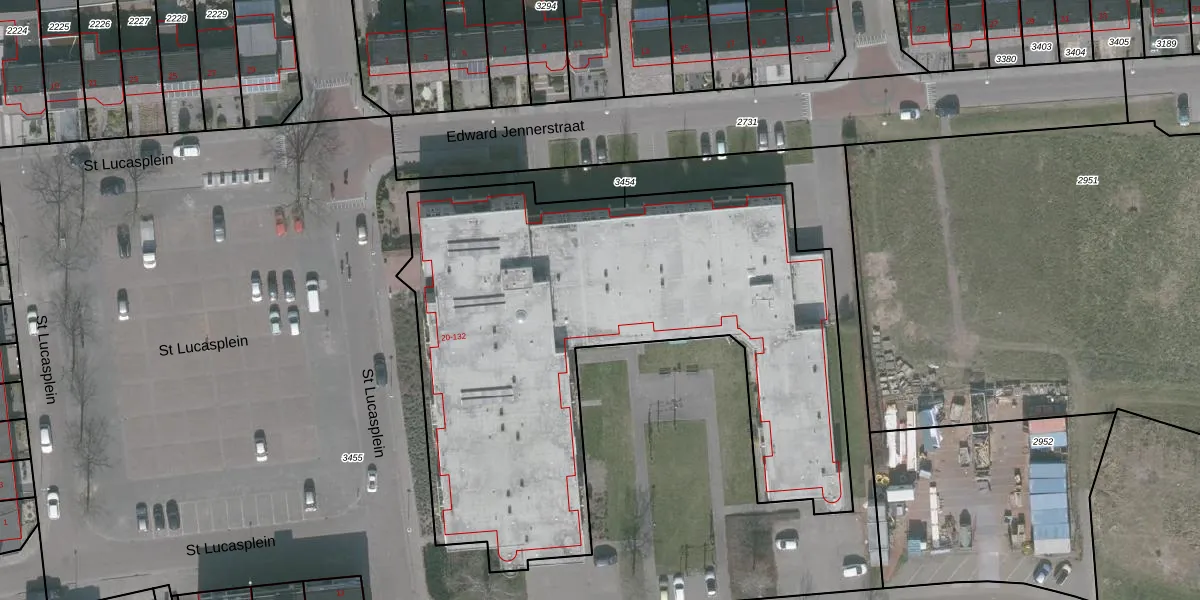 Het perceel waarop St Lucasplein 64 staat heeft een oppervlakte van 3060 m². Dit is een zeer groot perceel. De perceeloppervlakte wordt geregistreerd door het Kadaster. Gedetailleerde informatie over de maten van dit perceel kunt u vinden in het rapport Kadastrale kaart met maatvoering van St Lucasplein 64.