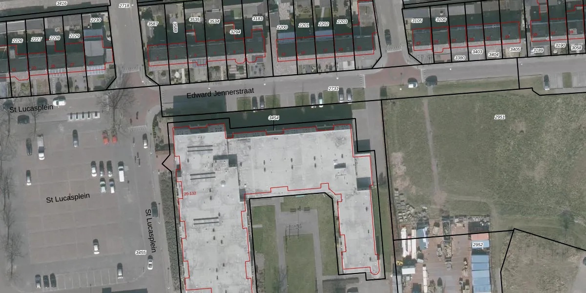 Het perceel waarop St Lucasplein 80 staat heeft een oppervlakte van 3060 m². Dit is een zeer groot perceel. De perceeloppervlakte wordt geregistreerd door het Kadaster. Gedetailleerde informatie over de maten van dit perceel kunt u vinden in het rapport Kadastrale kaart met maatvoering van St Lucasplein 80.