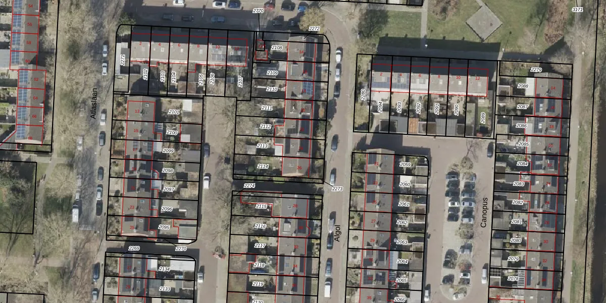 Het perceel waarop Algol 24 staat heeft een oppervlakte van 189 m². Dit is een middelgroot perceel. De perceeloppervlakte wordt geregistreerd door het Kadaster. Gedetailleerde informatie over de maten van dit perceel kunt u vinden in het rapport Kadastrale kaart met maatvoering van Algol 24.