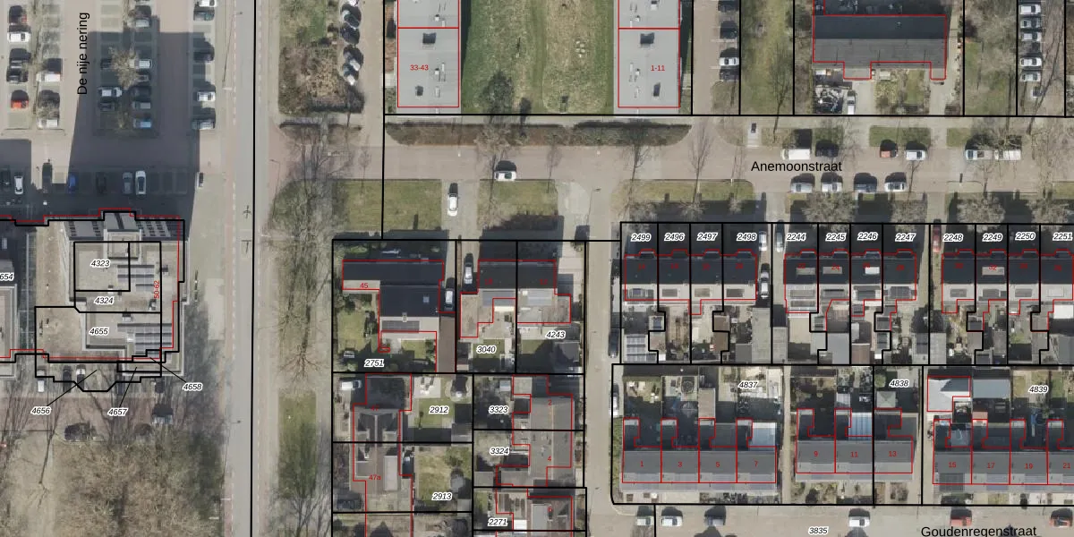 Het perceel waarop Anemoonstraat 12 staat heeft een oppervlakte van 318 m². Dit is een groot perceel. De perceeloppervlakte wordt geregistreerd door het Kadaster. Gedetailleerde informatie over de maten van dit perceel kunt u vinden in het rapport Kadastrale kaart met maatvoering van Anemoonstraat 12.