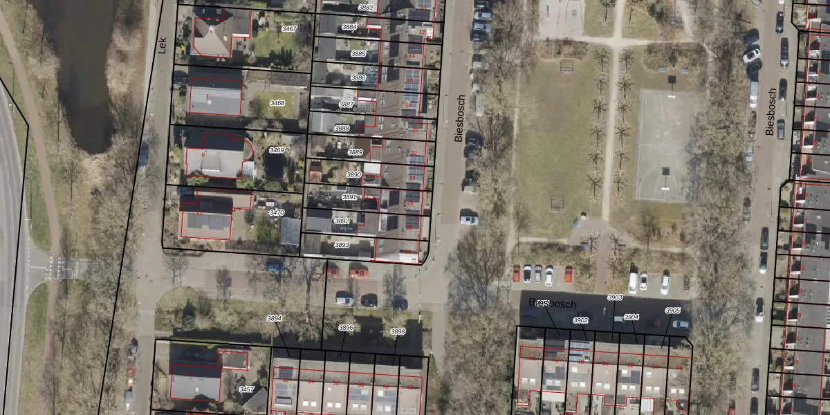 Gebruik de zoekbalk of klik op een perceel voor informatie over de adressen binnen dit perceel.