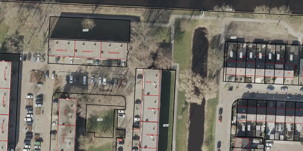 Het perceel waarop Capella 87 staat heeft een oppervlakte van 1956 m². Dit is een zeer groot perceel. De perceeloppervlakte wordt geregistreerd door het Kadaster. Gedetailleerde informatie over de maten van dit perceel kunt u vinden in het rapport Kadastrale kaart met maatvoering van Capella 87.