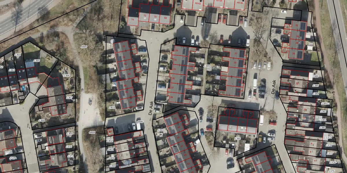 Het perceel waarop De Aak 37 staat heeft een oppervlakte van 1664 m². Dit is een zeer groot perceel. De perceeloppervlakte wordt geregistreerd door het Kadaster. Gedetailleerde informatie over de maten van dit perceel kunt u vinden in het rapport Kadastrale kaart met maatvoering van De Aak 37.