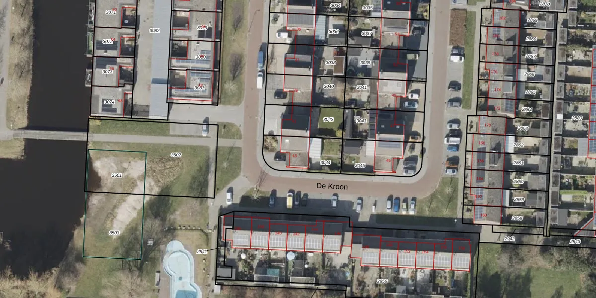 De Kroon 43 is gelegen op kadastraal perceel HGV00C3044. Deze kadastrale aanduiding is uniek en wordt gebruikt door het Kadaster om eigendomsrechten en andere zakelijke rechten vast te leggen. Het perceel maakt onderdeel uit van de kadastrale gemeente Hoogeveen.