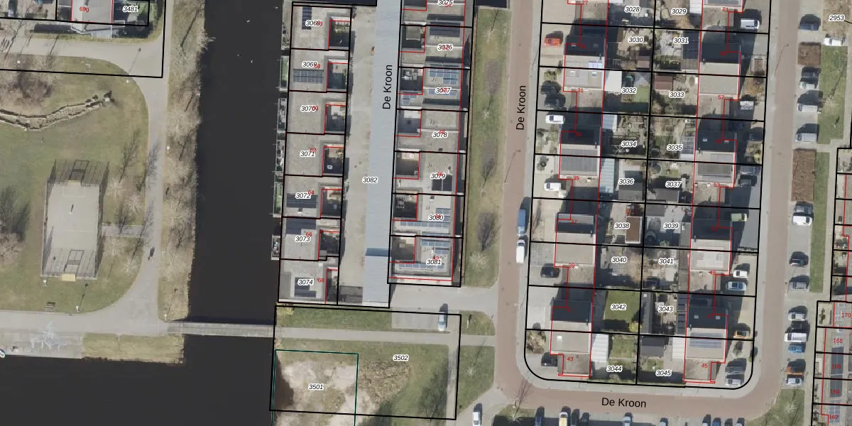 Het perceel waarop De Kroon 44 staat heeft een oppervlakte van 169 m². Dit is een middelgroot perceel. De perceeloppervlakte wordt geregistreerd door het Kadaster. Gedetailleerde informatie over de maten van dit perceel kunt u vinden in het rapport Kadastrale kaart met maatvoering van De Kroon 44.