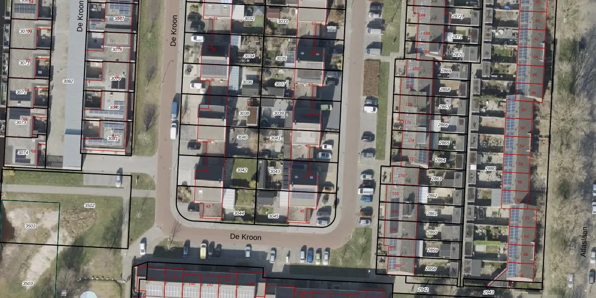 Het perceel waarop De Kroon 49 staat heeft een oppervlakte van 278 m². Dit is een middelgroot perceel. De perceeloppervlakte wordt geregistreerd door het Kadaster. Gedetailleerde informatie over de maten van dit perceel kunt u vinden in het rapport Kadastrale kaart met maatvoering van De Kroon 49.