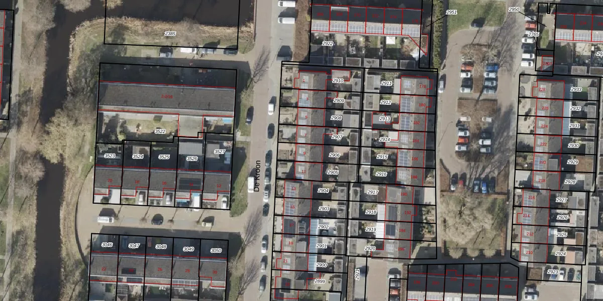 Het perceel waarop De Kroon 9 staat heeft een oppervlakte van 164 m². Dit is een middelgroot perceel. De perceeloppervlakte wordt geregistreerd door het Kadaster. Gedetailleerde informatie over de maten van dit perceel kunt u vinden in het rapport Kadastrale kaart met maatvoering van De Kroon 9.
