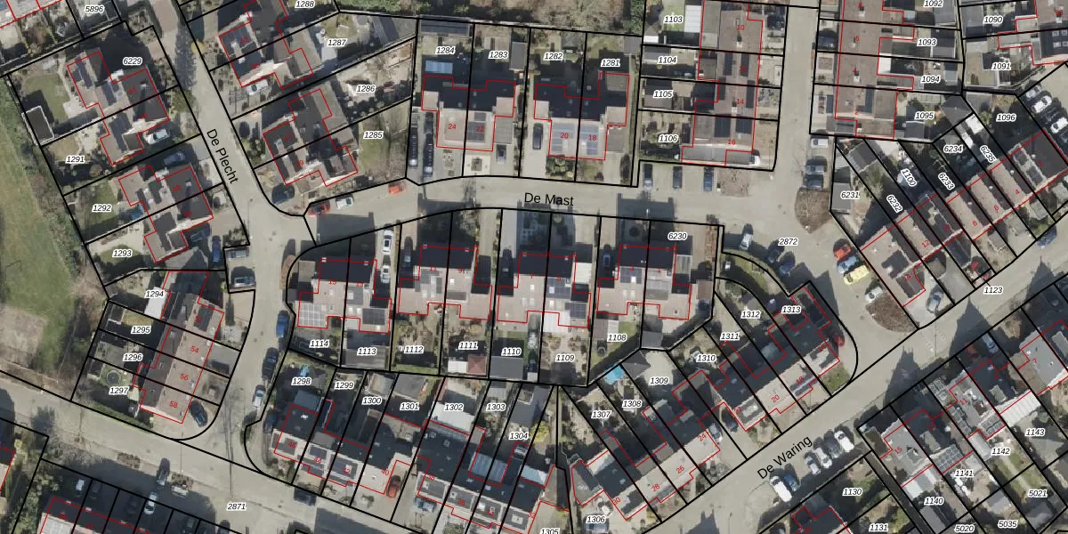 Het perceel waarop De Mast 7 staat heeft een oppervlakte van 298 m². Dit is een middelgroot perceel. De perceeloppervlakte wordt geregistreerd door het Kadaster. Gedetailleerde informatie over de maten van dit perceel kunt u vinden in het rapport Kadastrale kaart met maatvoering van De Mast 7.