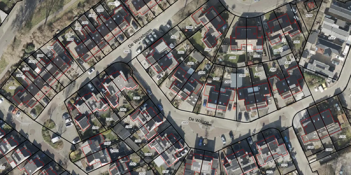 Het perceel waarop De Wanne 24 staat heeft een oppervlakte van 302 m². Dit is een groot perceel. De perceeloppervlakte wordt geregistreerd door het Kadaster. Gedetailleerde informatie over de maten van dit perceel kunt u vinden in het rapport Kadastrale kaart met maatvoering van De Wanne 24.