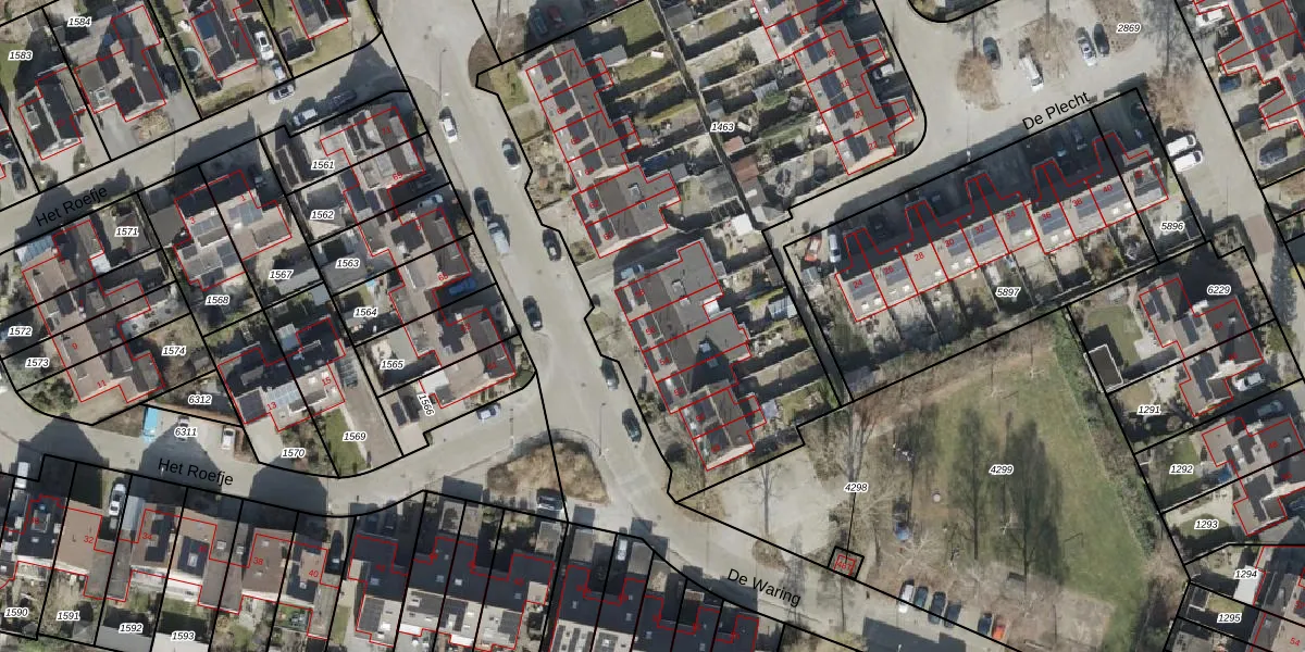 Het perceel waarop De Waring 56 staat heeft een oppervlakte van 3226 m². Dit is een zeer groot perceel. De perceeloppervlakte wordt geregistreerd door het Kadaster. Gedetailleerde informatie over de maten van dit perceel kunt u vinden in het rapport Kadastrale kaart met maatvoering van De Waring 56.