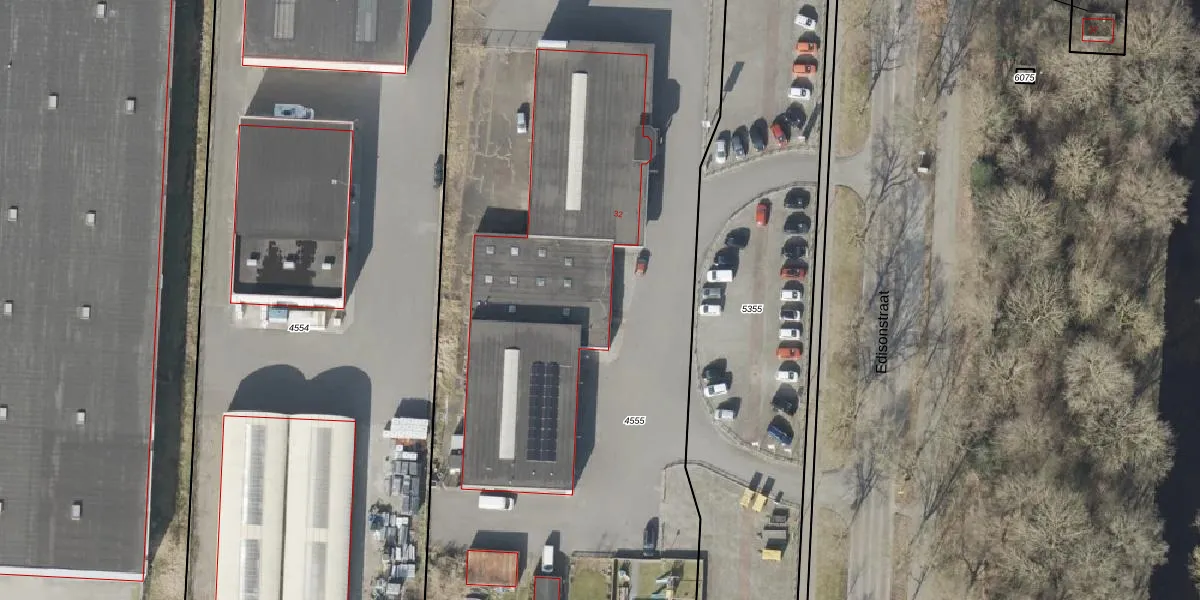 Het perceel waarop Edisonstraat 32 staat heeft een oppervlakte van 6762 m². Dit is een zeer groot perceel. De perceeloppervlakte wordt geregistreerd door het Kadaster. Gedetailleerde informatie over de maten van dit perceel kunt u vinden in het rapport Kadastrale kaart met maatvoering van Edisonstraat 32.