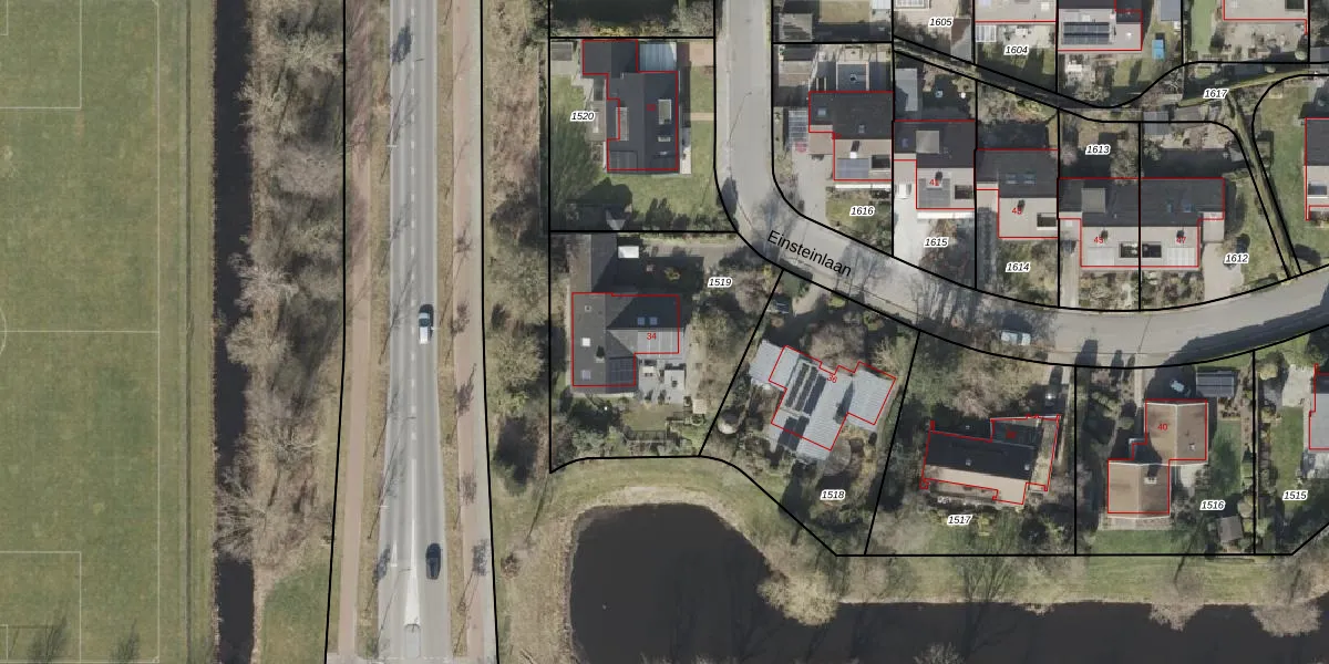 Het perceel waarop Einsteinlaan 34 staat heeft een oppervlakte van 1002 m². Dit is een zeer groot perceel. De perceeloppervlakte wordt geregistreerd door het Kadaster. Gedetailleerde informatie over de maten van dit perceel kunt u vinden in het rapport Kadastrale kaart met maatvoering van Einsteinlaan 34.
