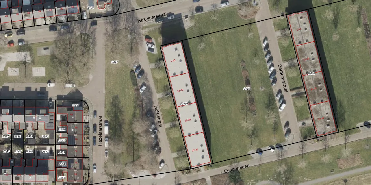 Het perceel waarop het adres ligt is HGV00-I-2416. De afkorting 'HGV00' staat voor kadastrale gemeente Hoogeveen. Het perceel is 845 m² groot. Dat is kleiner dan de gemiddelde perceeloppervlakte in Hoogeveen, dat op 4426,81 m² ligt. Het kleinste perceel in de kadastrale gemeente is 0 m² groot. De grootste perceeloppervlakte is 56,8 ha. Op het perceel liggen in totaal 24 adressen. In de Basisregistratie Kadaster (BRK) werden de grenzen van het perceel geregistreerd op 13-12-2007.