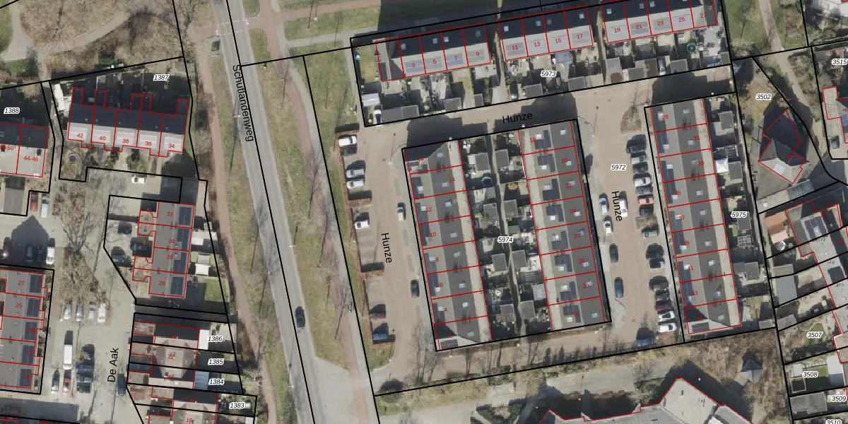 Het perceel waarop Hunze 12 staat heeft een oppervlakte van 2025 m². Dit is een zeer groot perceel. De perceeloppervlakte wordt geregistreerd door het Kadaster. Gedetailleerde informatie over de maten van dit perceel kunt u vinden in het rapport Kadastrale kaart met maatvoering van Hunze 12.