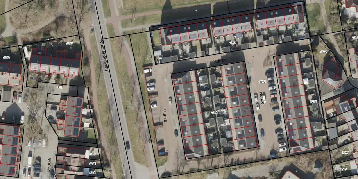 Het perceel waarop Hunze 14 staat heeft een oppervlakte van 2025 m². Dit is een zeer groot perceel. De perceeloppervlakte wordt geregistreerd door het Kadaster. Gedetailleerde informatie over de maten van dit perceel kunt u vinden in het rapport Kadastrale kaart met maatvoering van Hunze 14.
