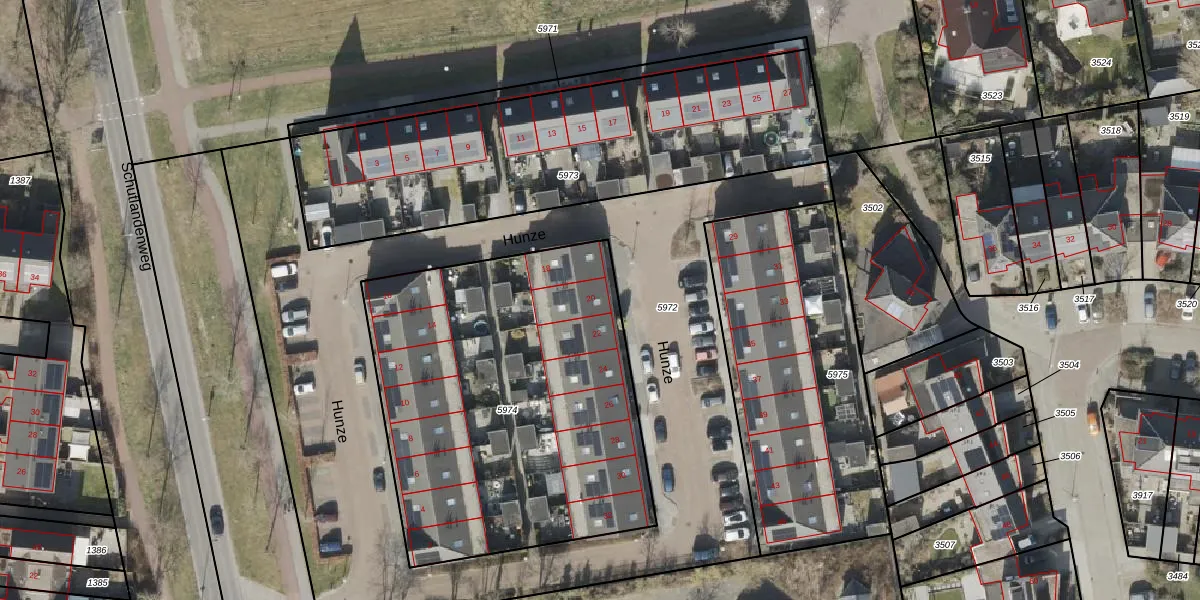 Hunze 20 is gelegen op kadastraal perceel HGV00P5974. Deze kadastrale aanduiding is uniek en wordt gebruikt door het Kadaster om eigendomsrechten en andere zakelijke rechten vast te leggen. Het perceel maakt onderdeel uit van de kadastrale gemeente Hoogeveen.