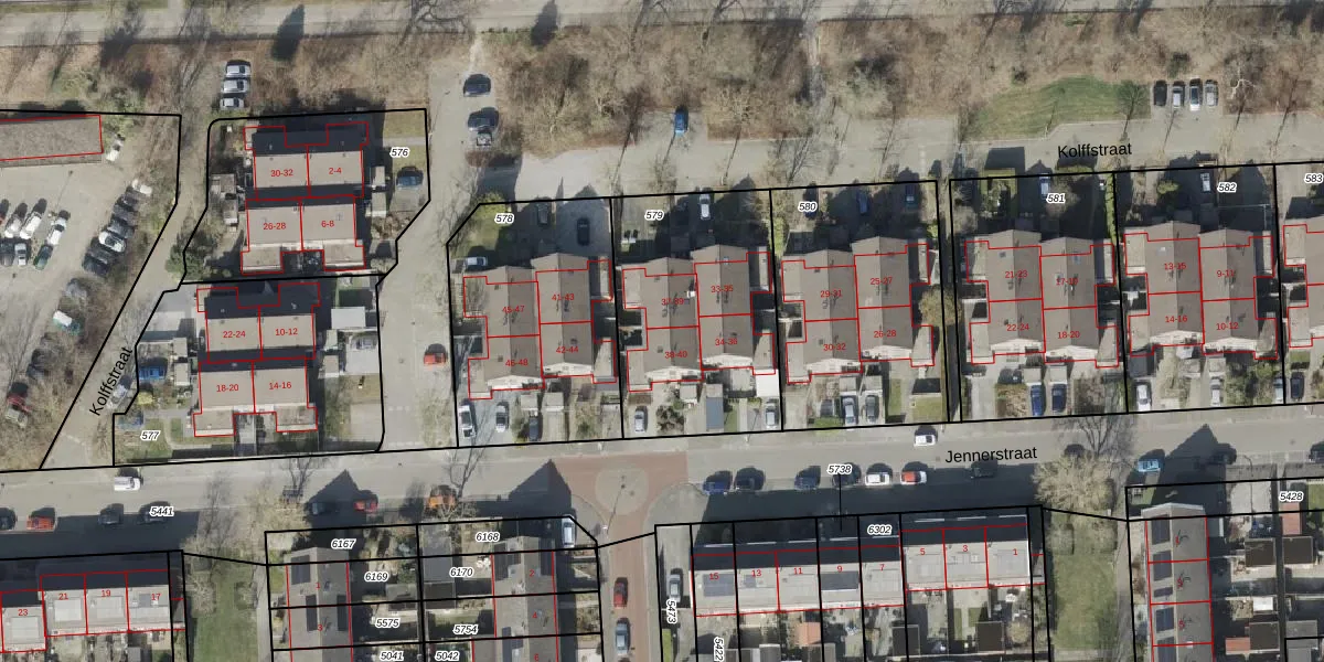Het perceel waarop Jennerstraat 40 staat heeft een oppervlakte van 878 m². Dit is een groot perceel. De perceeloppervlakte wordt geregistreerd door het Kadaster. Gedetailleerde informatie over de maten van dit perceel kunt u vinden in het rapport Kadastrale kaart met maatvoering van Jennerstraat 40.