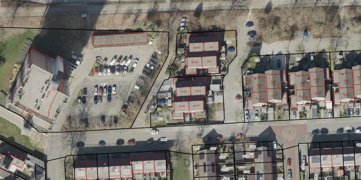 Het perceel waarop Kolffstraat 22 staat heeft een oppervlakte van 997 m². Dit is een groot perceel. De perceeloppervlakte wordt geregistreerd door het Kadaster. Gedetailleerde informatie over de maten van dit perceel kunt u vinden in het rapport Kadastrale kaart met maatvoering van Kolffstraat 22.