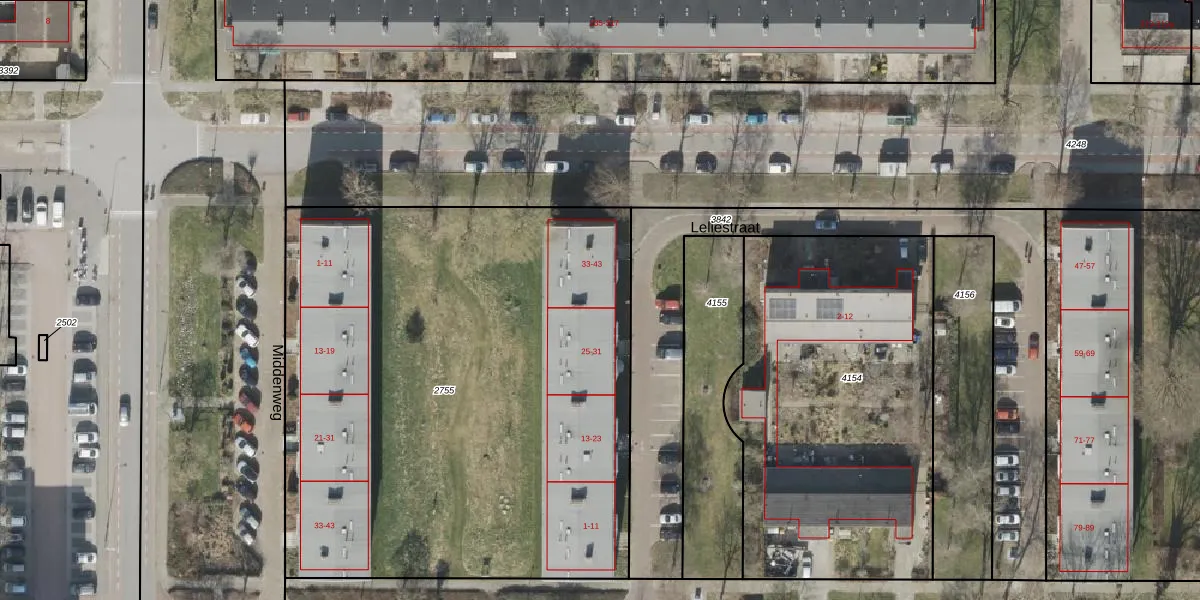 Leliestraat 33 is gelegen op kadastraal perceel HGV00I2755. Deze kadastrale aanduiding is uniek en wordt gebruikt door het Kadaster om eigendomsrechten en andere zakelijke rechten vast te leggen. Het perceel maakt onderdeel uit van de kadastrale gemeente Hoogeveen.
