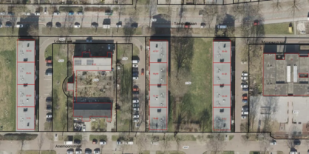 Het perceel waarop Leliestraat 63 staat heeft een oppervlakte van 3552 m². Dit is een zeer groot perceel. De perceeloppervlakte wordt geregistreerd door het Kadaster. Gedetailleerde informatie over de maten van dit perceel kunt u vinden in het rapport Kadastrale kaart met maatvoering van Leliestraat 63.