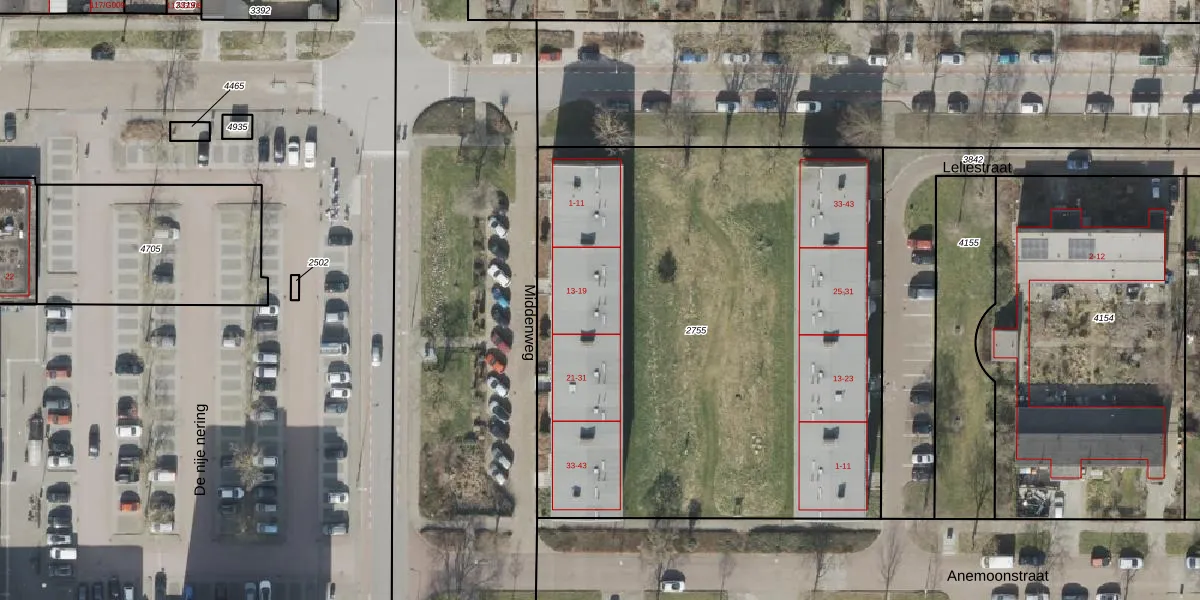 Middenweg 19 is gelegen op kadastraal perceel HGV00I2755. Deze kadastrale aanduiding is uniek en wordt gebruikt door het Kadaster om eigendomsrechten en andere zakelijke rechten vast te leggen. Het perceel maakt onderdeel uit van de kadastrale gemeente Hoogeveen.