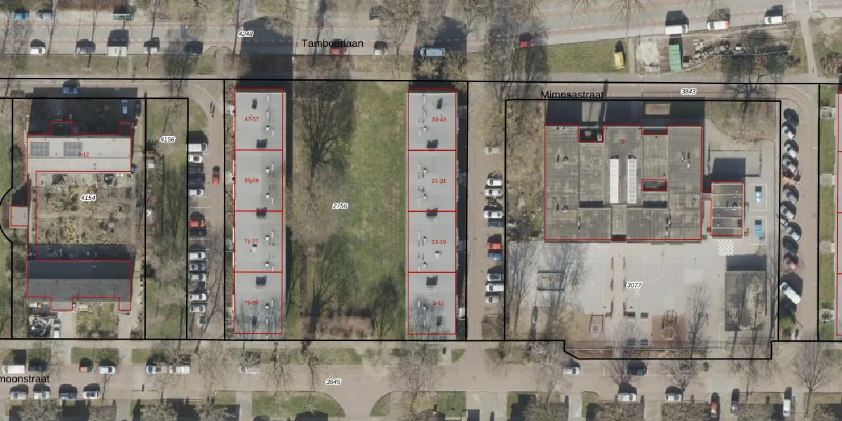 Het perceel waarop Mimosastraat 21 staat heeft een oppervlakte van 3552 m². Dit is een zeer groot perceel. De perceeloppervlakte wordt geregistreerd door het Kadaster. Gedetailleerde informatie over de maten van dit perceel kunt u vinden in het rapport Kadastrale kaart met maatvoering van Mimosastraat 21.