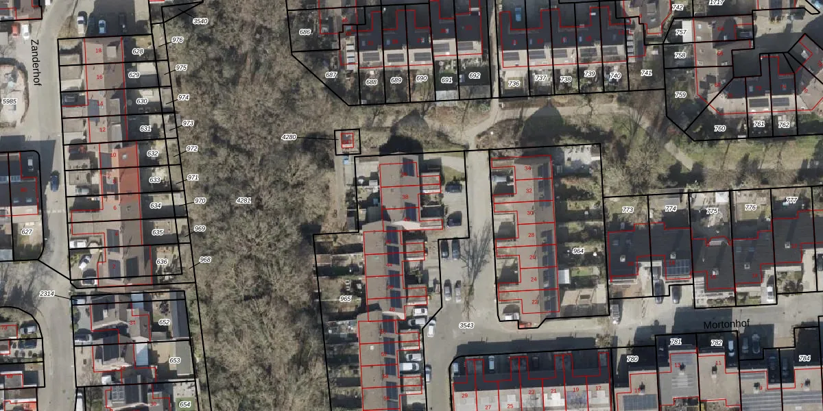 Het perceel waarop Mortonhof 38 staat heeft een oppervlakte van 1953 m². Dit is een zeer groot perceel. De perceeloppervlakte wordt geregistreerd door het Kadaster. Gedetailleerde informatie over de maten van dit perceel kunt u vinden in het rapport Kadastrale kaart met maatvoering van Mortonhof 38.