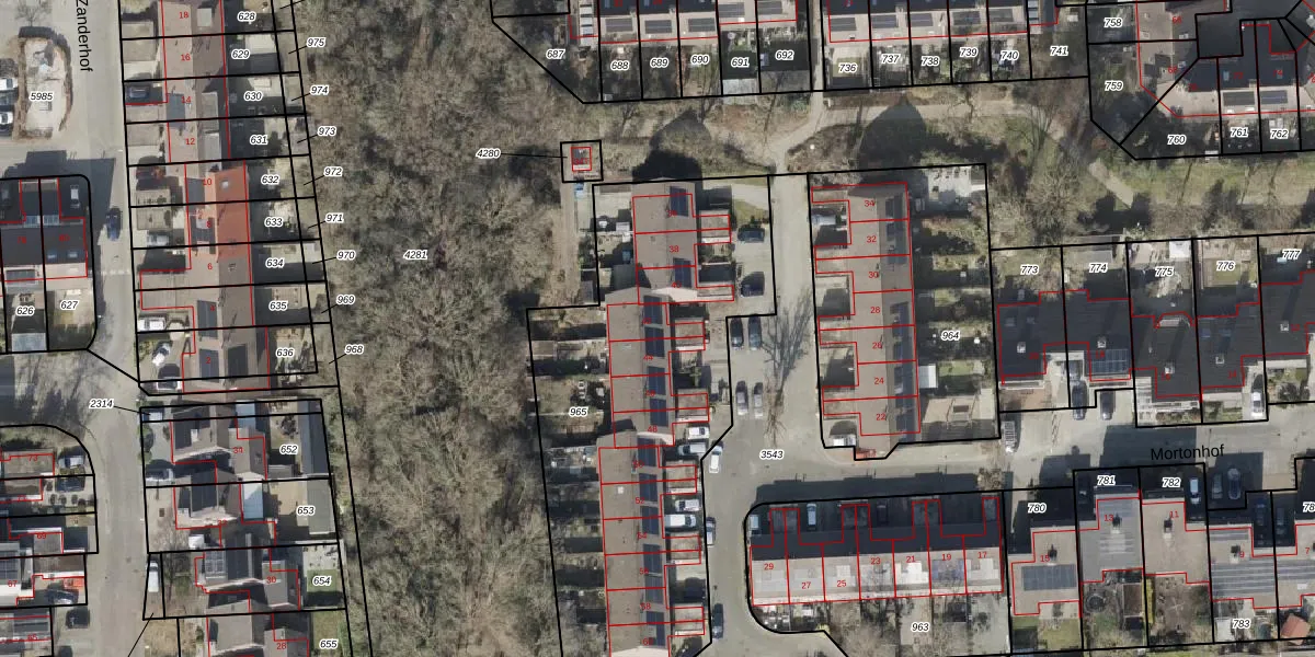Het perceel waarop Mortonhof 42 staat heeft een oppervlakte van 1953 m². Dit is een zeer groot perceel. De perceeloppervlakte wordt geregistreerd door het Kadaster. Gedetailleerde informatie over de maten van dit perceel kunt u vinden in het rapport Kadastrale kaart met maatvoering van Mortonhof 42.