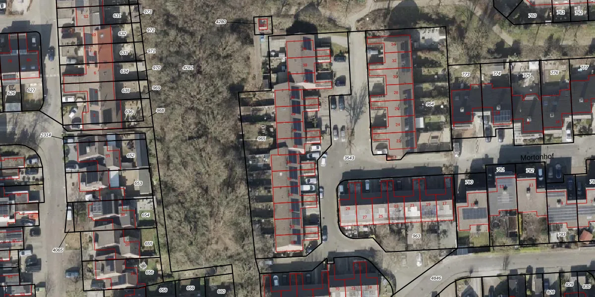 Het perceel waarop Mortonhof 48 staat heeft een oppervlakte van 1953 m². Dit is een zeer groot perceel. De perceeloppervlakte wordt geregistreerd door het Kadaster. Gedetailleerde informatie over de maten van dit perceel kunt u vinden in het rapport Kadastrale kaart met maatvoering van Mortonhof 48.