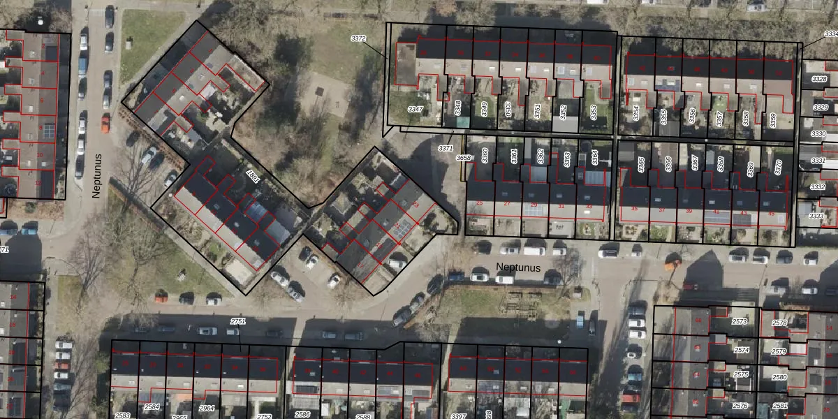 Het perceel waarop Neptunus 23 staat heeft een oppervlakte van 2073 m². Dit is een zeer groot perceel. De perceeloppervlakte wordt geregistreerd door het Kadaster. Gedetailleerde informatie over de maten van dit perceel kunt u vinden in het rapport Kadastrale kaart met maatvoering van Neptunus 23.