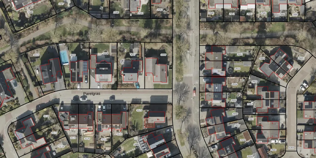 Parelgras 2 is gelegen op kadastraal perceel HGV00P3006. Deze kadastrale aanduiding is uniek en wordt gebruikt door het Kadaster om eigendomsrechten en andere zakelijke rechten vast te leggen. Het perceel maakt onderdeel uit van de kadastrale gemeente Hoogeveen.