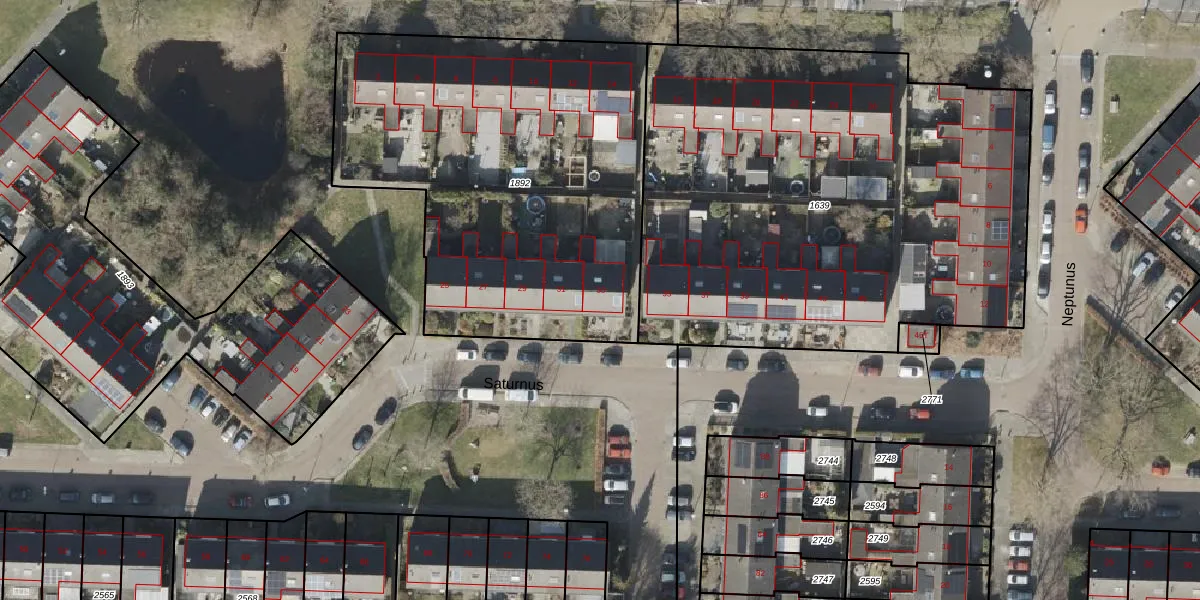 Het perceel waarop Saturnus 33 staat heeft een oppervlakte van 2198 m². Dit is een zeer groot perceel. De perceeloppervlakte wordt geregistreerd door het Kadaster. Gedetailleerde informatie over de maten van dit perceel kunt u vinden in het rapport Kadastrale kaart met maatvoering van Saturnus 33.