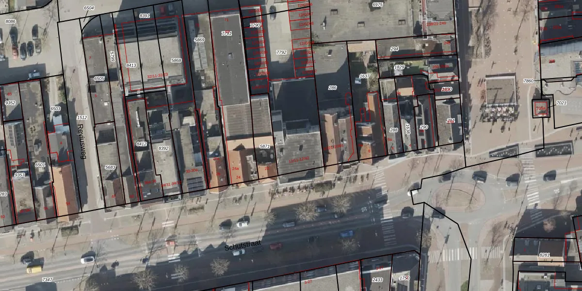 Het perceel waarop Schutstraat 12-11 staat heeft een oppervlakte van 1069 m². Dit is een zeer groot perceel. De perceeloppervlakte wordt geregistreerd door het Kadaster. Gedetailleerde informatie over de maten van dit perceel kunt u vinden in het rapport Kadastrale kaart met maatvoering van Schutstraat 12-11.