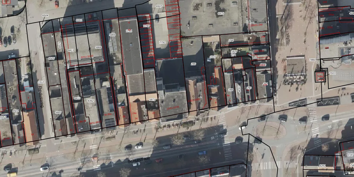 Schutstraat 12-22 is gelegen op kadastraal perceel HGV00O7792. Deze kadastrale aanduiding is uniek en wordt gebruikt door het Kadaster om eigendomsrechten en andere zakelijke rechten vast te leggen. Het perceel maakt onderdeel uit van de kadastrale gemeente Hoogeveen.